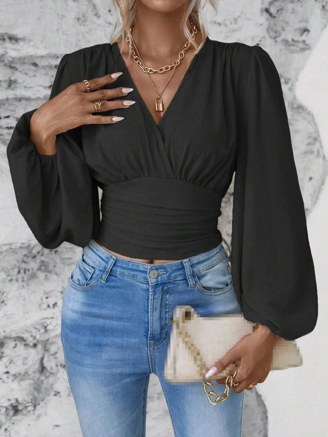 2024 Primavera Autunno Donna Nuova Collezione Moda Vita Sexy Scollo a V Manica a Sacco Tinta Unita Maglietta a Maniche Lunghe Stropicciata