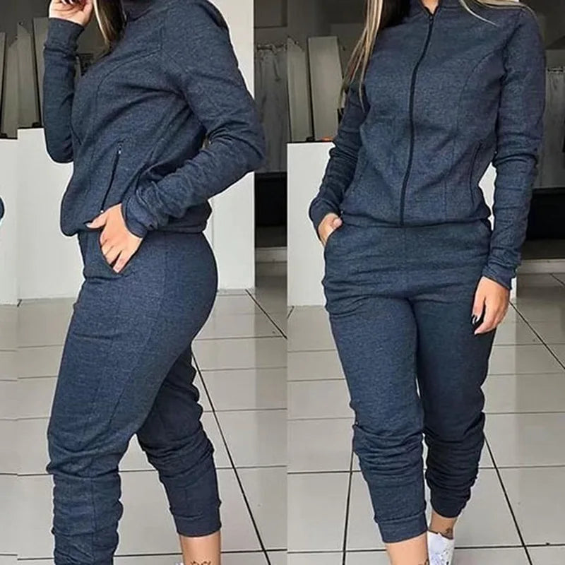 Women Pant Sets Pocket Long Pants Solid Casual Spliced Zipper Stand Collar Coats Full Sleeve Jackets Outwear Lady Regular